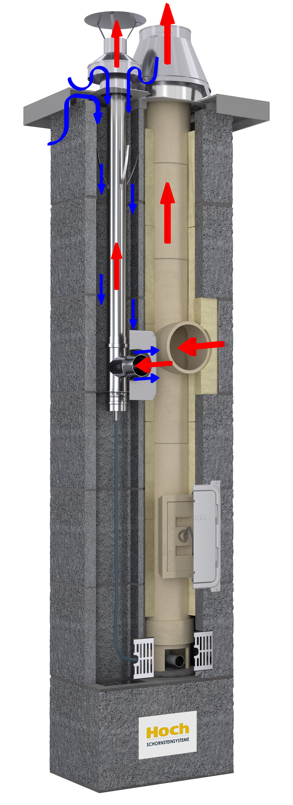 Der doppelzügige F90-Leichtbauschornstein von HOCH eignet sich sowohl für den Innen- als auch den Außeneinsatz durch seine 2- und 3-schalige Bauweise.